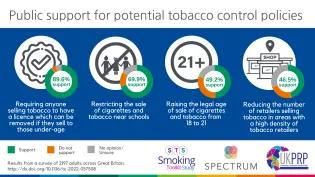 People in Britain strongly support restricting the sale of tobacco near schools and raising the legal age of sale to 21, finds a new SPECTRUM study. 26 August 2022The research, published in Tobacco Control, examined data from the Cancer Research UK and SPECTRUM-funded Smoking Toolkit Study, which has surveyed approximately 1,700 adults each month from England since 2006, and 2,200 adults each month from England, Scotland and Wales, since 2020.A collaboration across UCL, The University of Edinburgh and Cardiff University, the research team examined data from September 2021, which asked participants about their views on potential policies targeting the availability of tobacco and cigarettes.Strong public supportThe results indicated that most of those surveyed supported retailers having their license revoked if they sold tobacco products to those under-age (89.6%) and for restrictions on the sale of cigarettes and tobacco near schools (69.9%).Meanwhile, half (49.2%) thought that the legal age of sale for cigarettes and tobacco should be raised to 21, compared with just under a third who were opposed to the idea (30.7%).Participants were also in favour of reducing the number of retailers selling tobacco in neighbourhoods that already had a high density of tobacco retailers – with almost half (46.5%) showing their support, compared with less than a quarter (23.3%) who disagreed. Our findings indicate that policies to restrict tobacco retail near schools, and for tobacco retailer licences would receive strong majority support from the British public if legislated.Raising the age of sale to 21 and reducing the number of tobacco retailers also received greater support than opposition.However, a substantial proportion of respondents report having no opinion either way on these policies, suggesting there is potential to grow public support through clearer communication on the evidence and benefits of these policies.Moreover, support for tobacco availability policy may grow, and opposition diminish, if policies are demonstrated to be effective, and as future generations grow up without cigarettes. Dr Loren Kock Lead author, UCL Institute of Epidemiology & Health Smokefree ambitionThere are around 6.9million adult cigarette smokers in the UK, who spend approximately £15.6billion a year on legal and illicit tobacco.Currently the law prohibits the sale of tobacco products to those under the age of 18. And previous studies have shown that a ban on the sale of tobacco products near schools could stop children from taking up the habit.In 2019, the UK Government set an objective for England to be smokefree by 2030, meaning only 5% of the population would smoke by then. However, a recent report by Dr Javed Khan OBE, highlighted that particularly poorer areas may struggle to reach this target unless the rate of decline of people who smoke is accelerated by 40%. Across the UK nations targets have been set to radically reduce the proportion of people that smoke over the next decade.This new research shows that the public strongly support the introduction of new measures needed to meet these ambitious targets, including reducing the local availability of tobacco products.Having wide scale public support to introduce restrictions on the sales of tobacco should embolden the UK and devolved governments to introduce new policies restricting access to tobacco, particularly amongst children, and ensure future generations are tobacco free. Professor Niamh Shortt Personal Chair of Health Geographies, School of GeoSciences, University of Edinburgh Study limitationsThe use of cross-sectional observational data and potentially unmeasured covariates limits the ability to infer causality between included variables (namely sociodemographic and smoking and quitting characteristics) and support for policies. The sample sizes for the sub-group analyses in Scotland and Wales analyses may also be underpowered.Data on support for tobacco availability were collected during one survey wave, and if further data were collected the results may change.Related linksAccess the paper | BMJ Tobacco ControlVisit the Smoking Toolkit Study website | England, Scotland, WalesRecommendations from the All Party Parliamentary Group on Smoking and Health for the Tobacco Control Plan 2021 | Delivering a smokefree 2030Independent review by Dr Javed Khan OBE into the government’s ambition to make England smokefree by 2030 | Making smoking obsolete Publication date 26 Aug, 2022